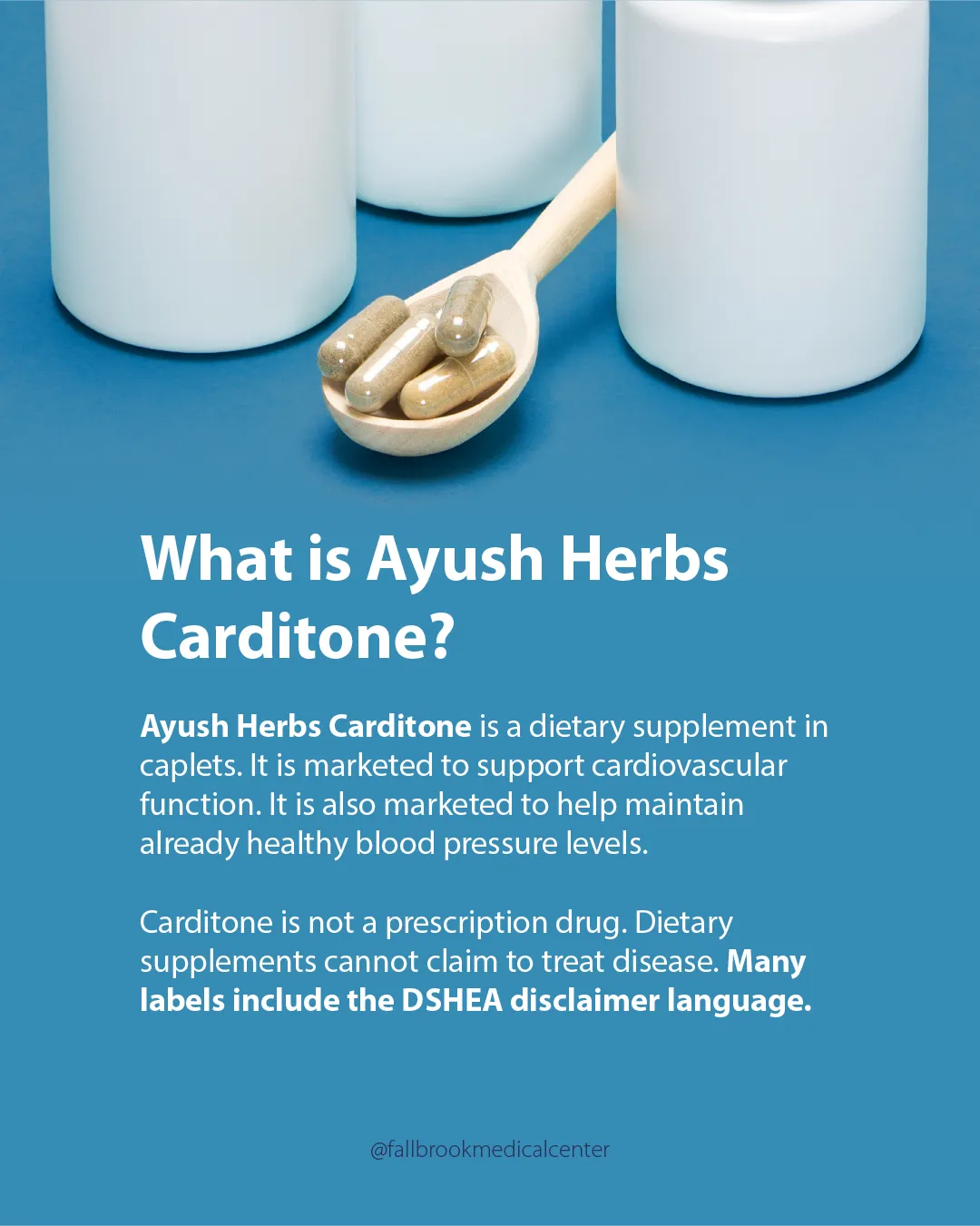 Ayush Herbs Carditone is a dietary supplement in caplets. It is marketed to support cardiovascular function. It is also marketed to help maintain already healthy blood pressure levels.