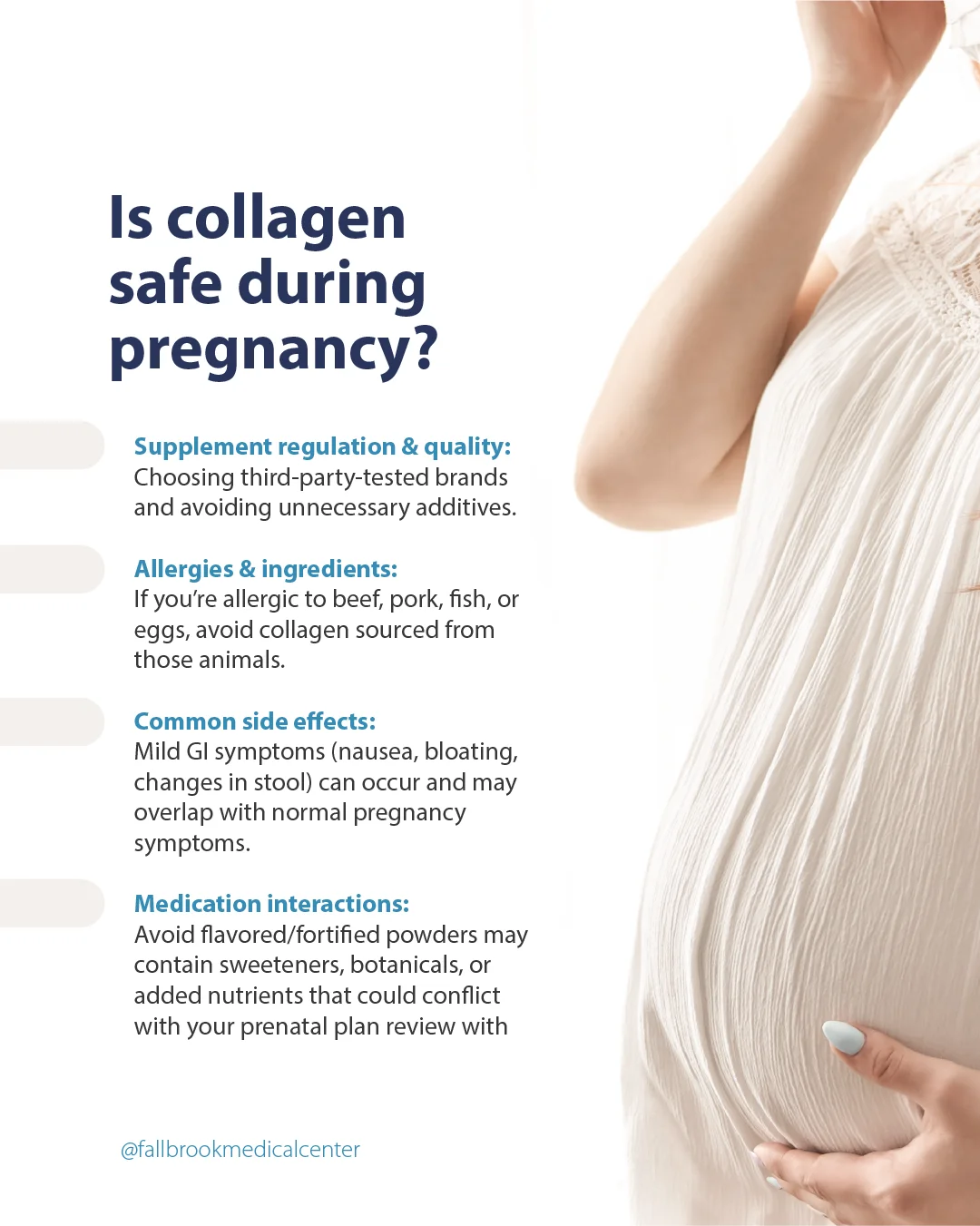 - Medication interactions: Collagen is food-derived protein; direct interactions are unlikely, but flavored/fortified powders may contain sweeteners, botanicals, or added nutrients that could conflict with your prenatal plan review with your OB or RD.