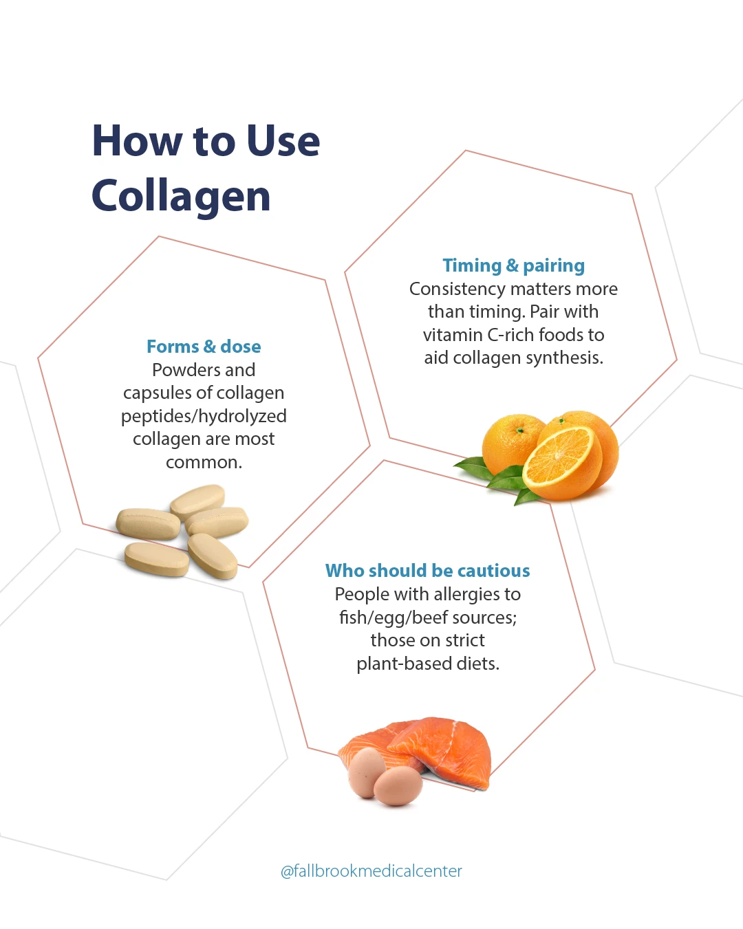- Forms & dose: Powders and capsules of collagen peptides/hydrolyzed collagen are most common. Many studies use 2.5–15 g/day for 8–12 weeks. (Discuss the right amount with your clinician.)
