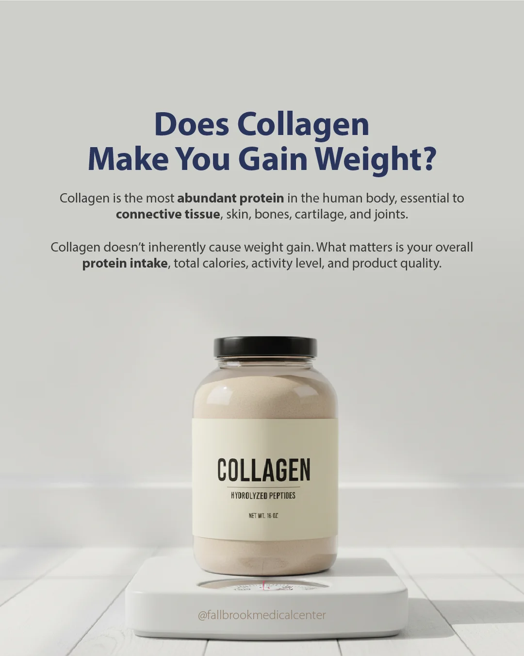 But will collagen change your body composition in a way that leads to unwanted weight? Short answer: on its own, collagen doesn’t inherently cause weight gain. What matters is your overall protein intake, total calories, activity level, and product quality. Below, Fallbrook Medical Center explains the science, practical use, and safety so you can decide with confidence.