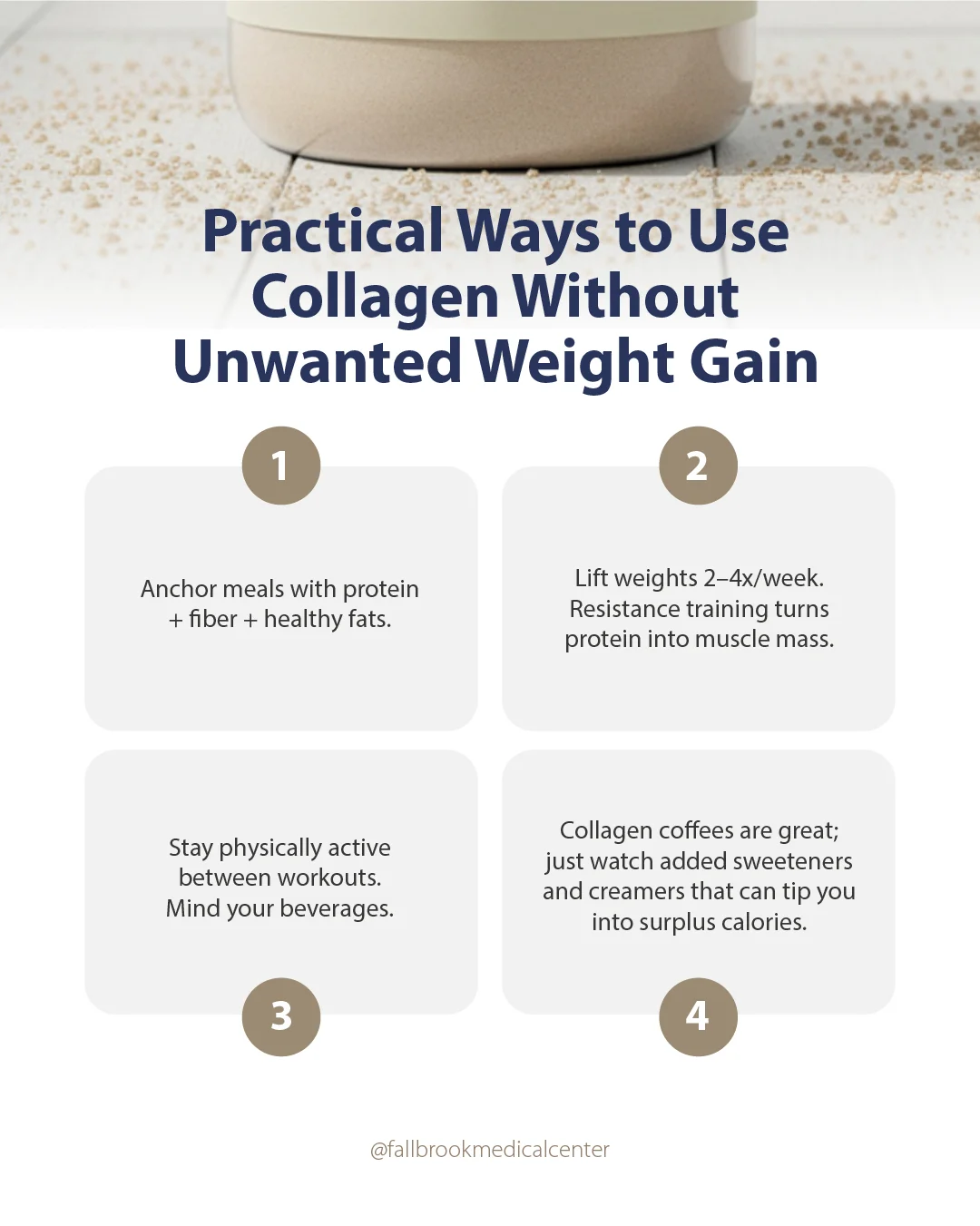 Bottom line: Collagen doesn’t inherently cause fat gain; how you use it within your total diet and movement pattern matters most.