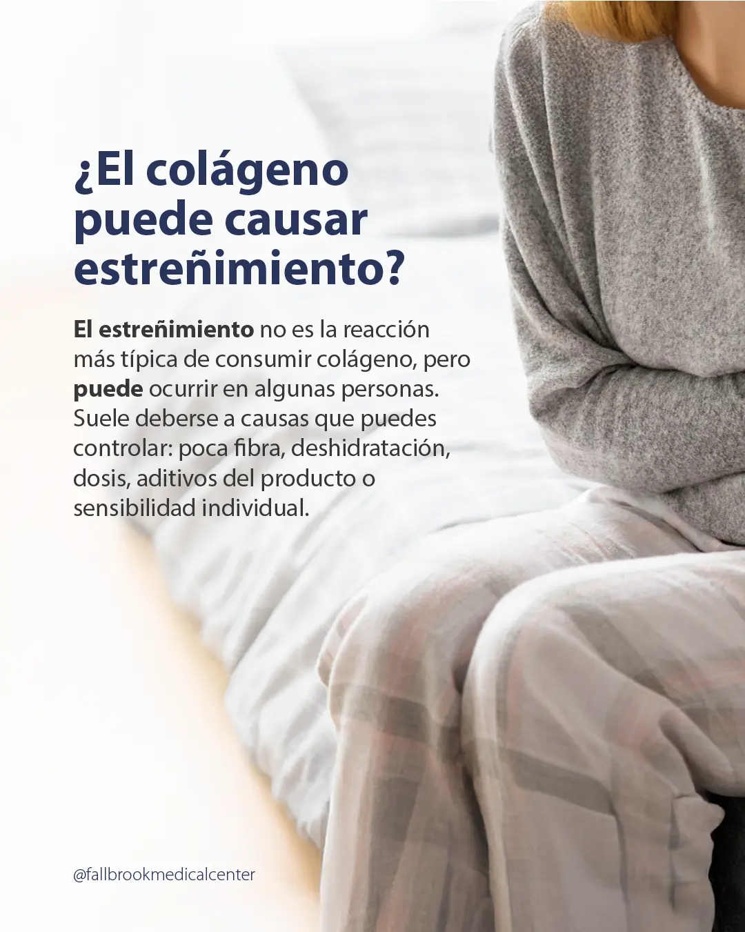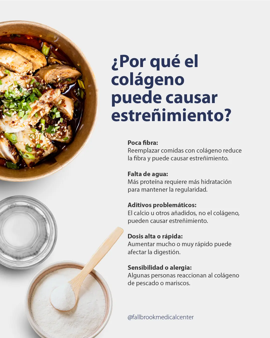 El colágeno es casi pura proteína de colágena y aporta poca o nada de fibra. Si El colágeno reemplaza una colación o desayuno que contenía granos integrales o fruta, baja tu ingesta de fibra. Esto puede llevar a estreñimiento, ya que la fibra es importante para el sistema digestivo. Las revisiones sobre manejo del estreñimiento destacan de forma consistente la fibra y los líquidos adecuados para mejorar la frecuencia y la facilidad del movimiento intestinal.