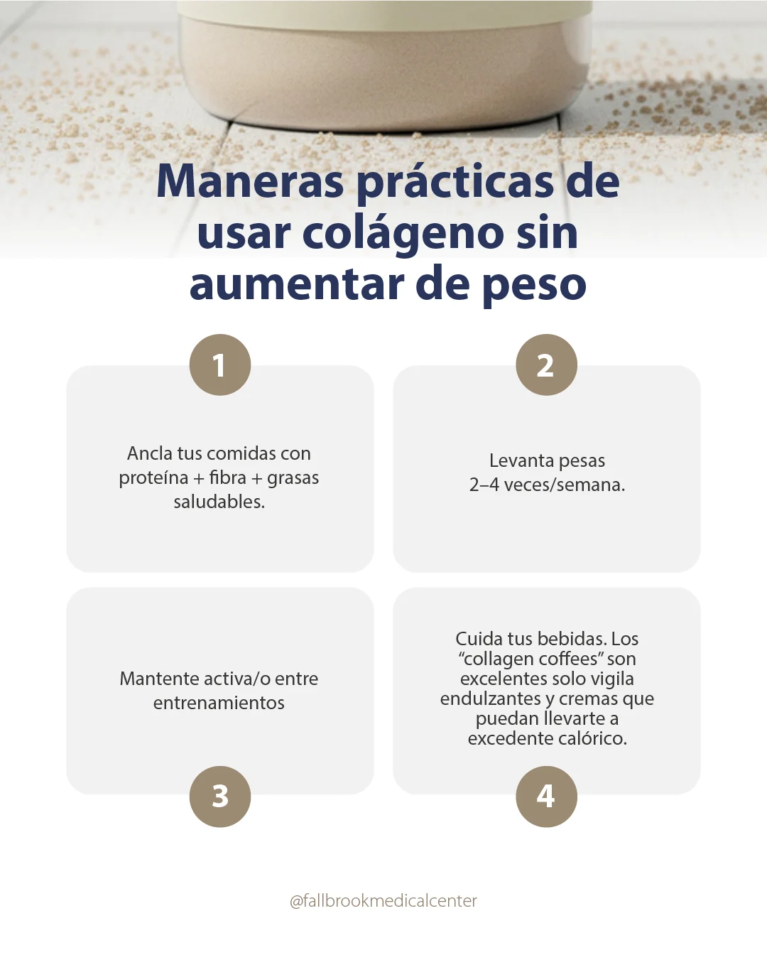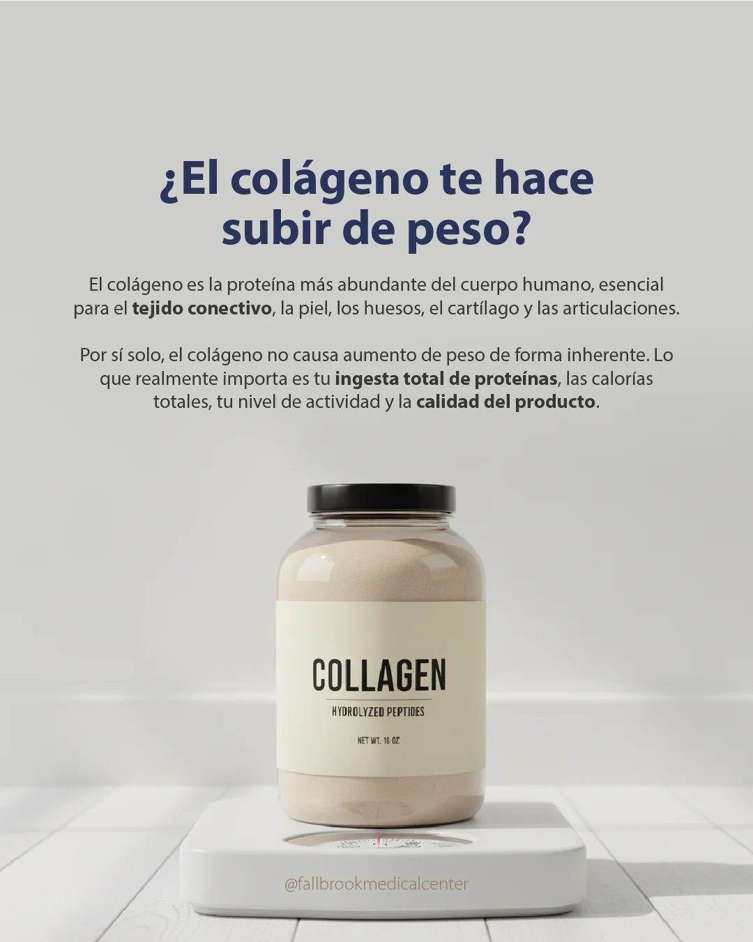 Pero, ¿el colágeno cambiará tu composición corporal de una manera que lleve a un aumento de peso no deseado? Resumen corto: por sí solo, el colágeno no causa aumento de peso de forma inherente. Lo que realmente importa es tu ingesta total de proteínas, las calorías totales, tu nivel de actividad y la calidad del producto. A continuación, Fallbrook Medical Center explica la ciencia, el uso práctico y la seguridad para que puedas decidir con confianza.