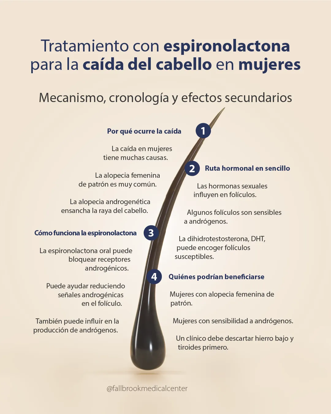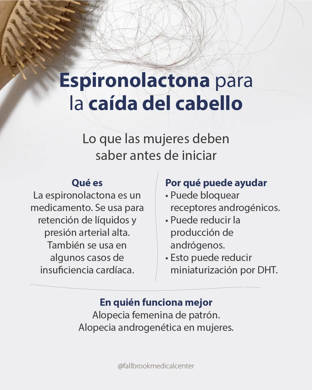 La espironolactona puede apoyar el tratamiento de caída en algunas mujeres. Es más relevante en adelgazamiento patrón sensible a andrógenos. Los resultados toman tiempo y requieren seguimiento. La seguridad importa con otras condiciones y medicamentos.