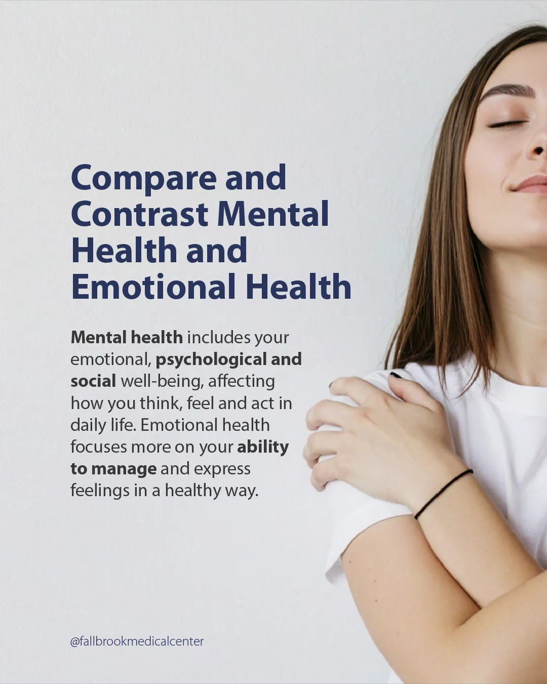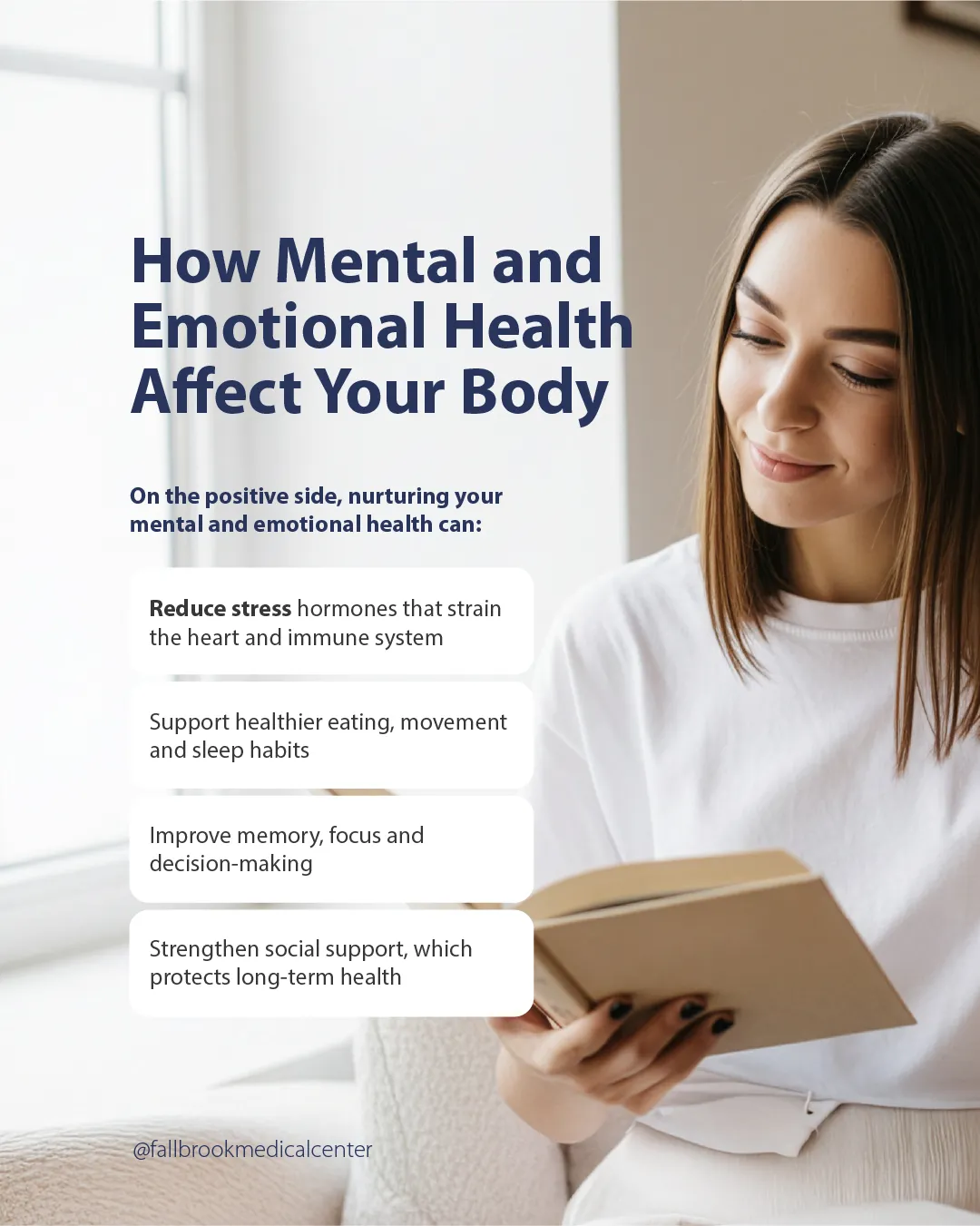 At Fallbrook Medical Center, we see mental and emotional well-being as part of whole-person care. Mental health includes your emotional, psychological and social well-being, affecting how you think, feel and act in daily life. Emotional health focuses more on your ability to manage and express feelings in a healthy way. Both matter and both can be supported.