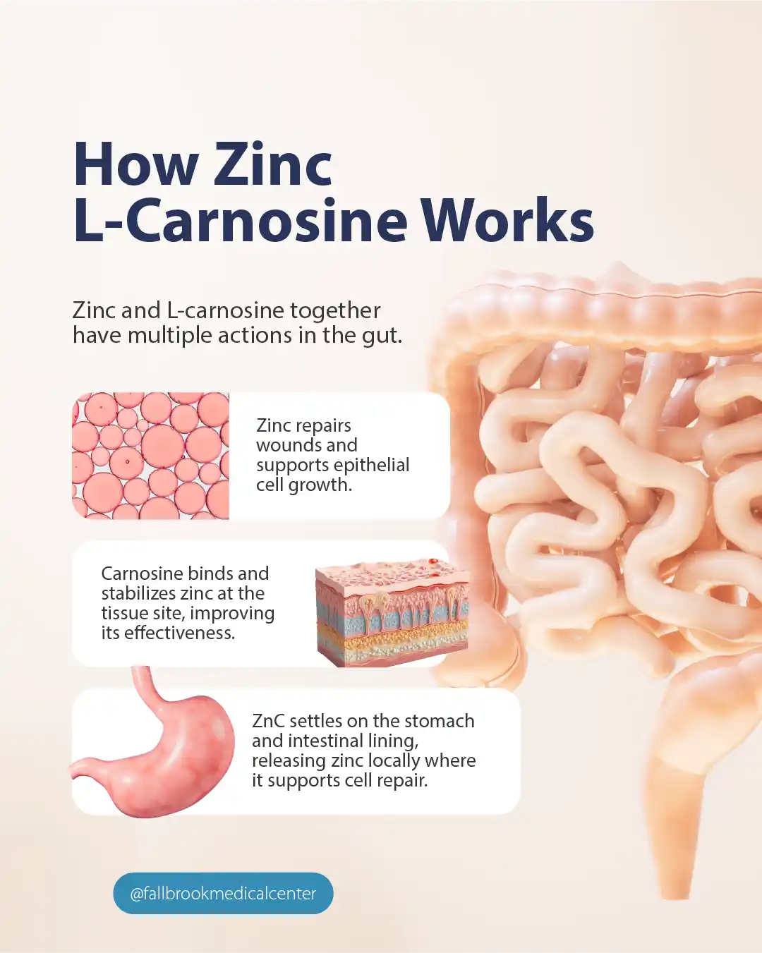Zinc and L-carnosine together have multiple actions in the gut. Zinc repairs wounds and supports epithelial cell growth. Carnosine binds and stabilizes zinc at the tissue site, improving its effectiveness. ZnC settles on the stomach and intestinal lining, releasing zinc locally where it supports cell repair.